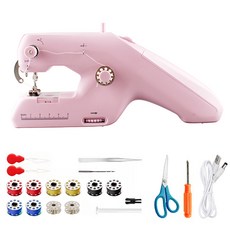Cooela 미니 자동 재봉틀 + 실 + 바늘 + 가위 세트 가정용 휴대용, 핑크 세트, 핑크 세트