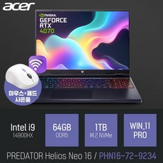 에이서 프레데터 헬리오스 네오 16 코어i9 인텔 14세대 지포스 RTX 4070, 블랙, 1TB, 64GB, WIN11 Home, PHN16-72-9234
