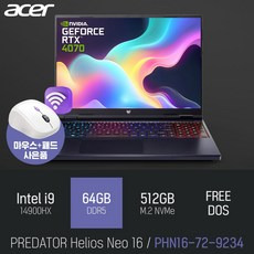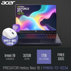 에이서 프레데터 헬리오스 네오 16 코어i9 인텔 14세대 지포스 RTX 4070, 블랙, 1TB, 32GB, Free DOS, PHN16-72-9234