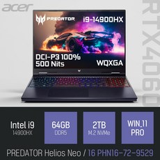 에이서 프레데터 헬리오스 네오 16 코어i9 인텔 14세대 지포스 RTX 4070, 블랙, 6TB, 64GB, WIN11 Home, PHN16-72-9234