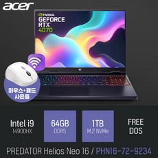 에이서 프레데터 헬리오스 네오 16 코어i9 인텔 14세대 지포스 RTX 4070, 블랙, 8TB, 64GB, Free DOS, PHN16-72-9234