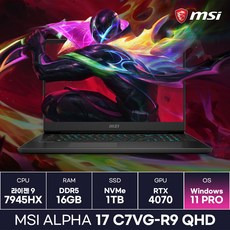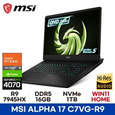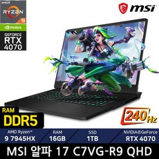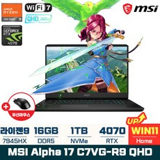 MSI 알파 17 C7VG-R9 QHD 라이젠9 7945HX RTX4070 17.3형 240Hz Wi-Fi 7 (WIN11홈 설치), WIN11 Home, 16GB, 1TB, 블랙