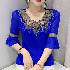 모네르 플라워 큐빅 여성 라인댄스복 상의, 블루