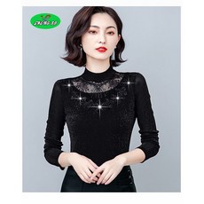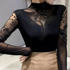 시스루 라인 댄스복 샤이닝 펄 레이스 반짝이 탑 가을과 겨울의 넥 하이 따뜻함 레이스, 블랙, M