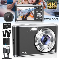 전면 및 후면 렌즈가 포함된 4K 디지털 카메라 자동 초점 동영상 블로그 카메라 + 32GB SD 카드 4800W 16X 디지털 줌 초보자를 위한 소형 여행 셀카 카메라, 검은색
