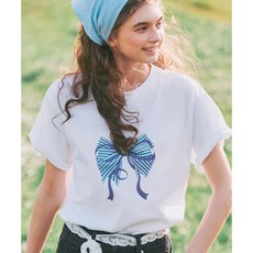 론론 RONRON GINGHAM DOUB르 LE RIBBON BASIC FIT T SHIRT WHITE BLUE